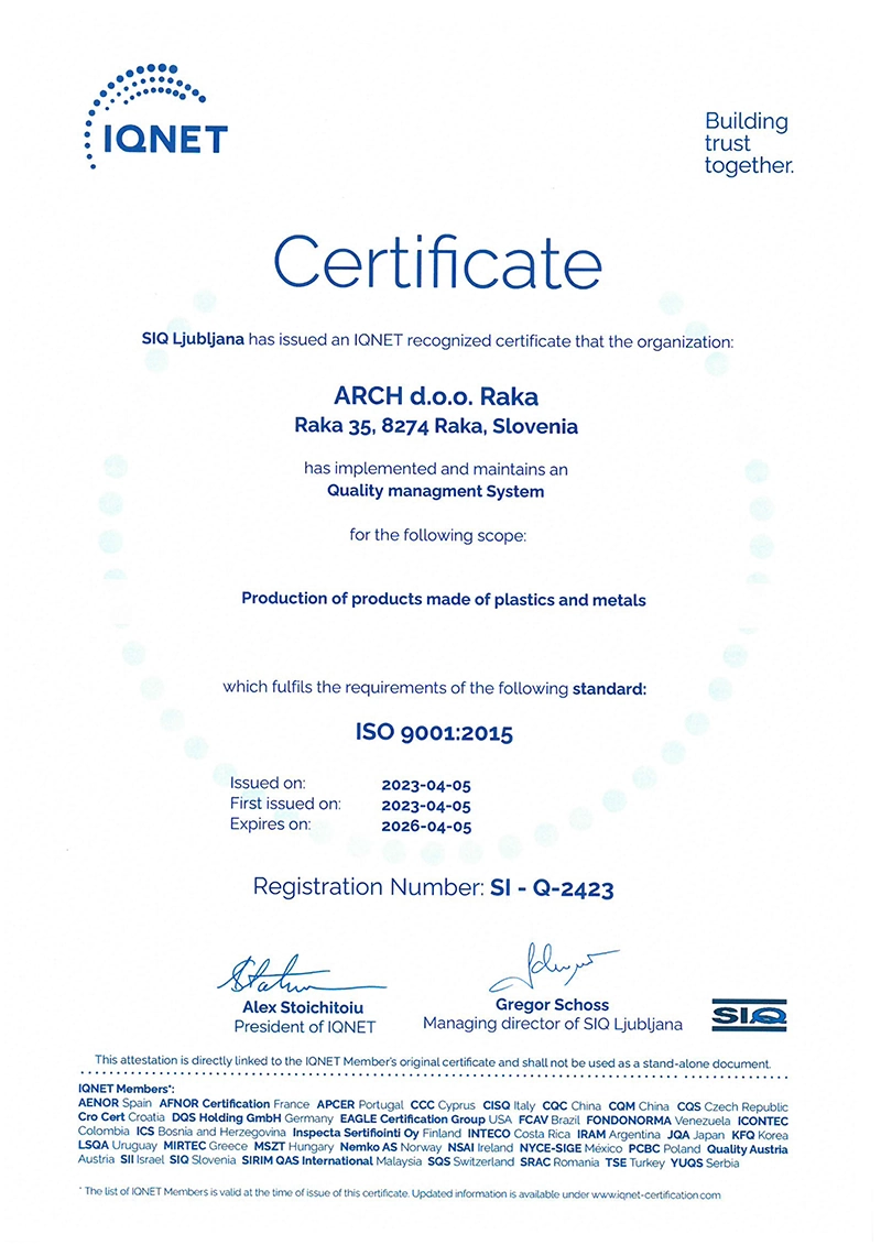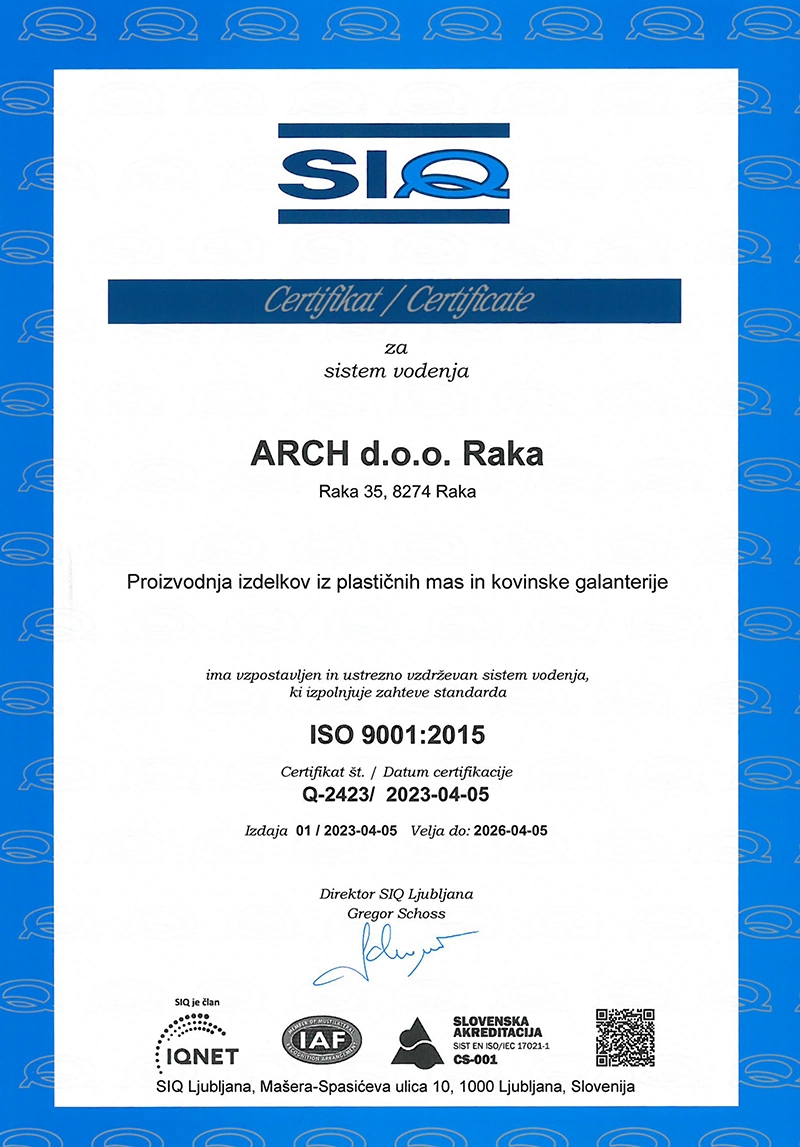 V podjetju ARCH d.o.o. je kakovost na prvem mestu. Naše poslovanje in proizvodnja potekata skladno s certifikatom ISO